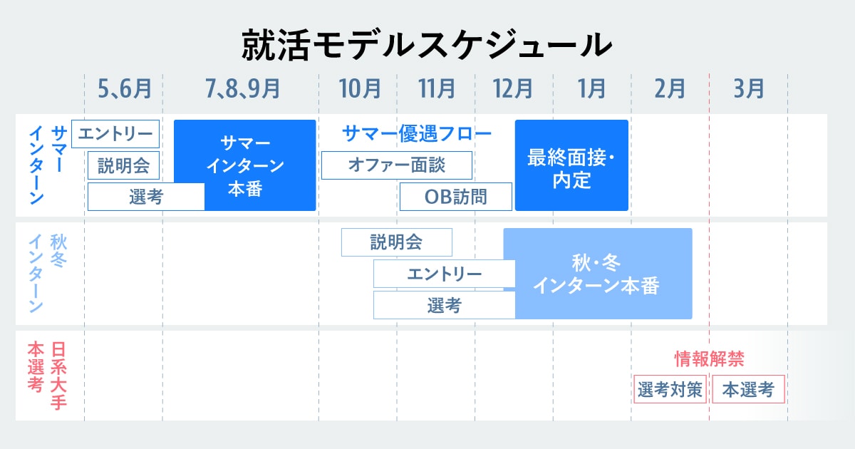 では、次に今後の就活スケジュールを確認し、サマーインターンに向けての選考対策を進めていきましょう。