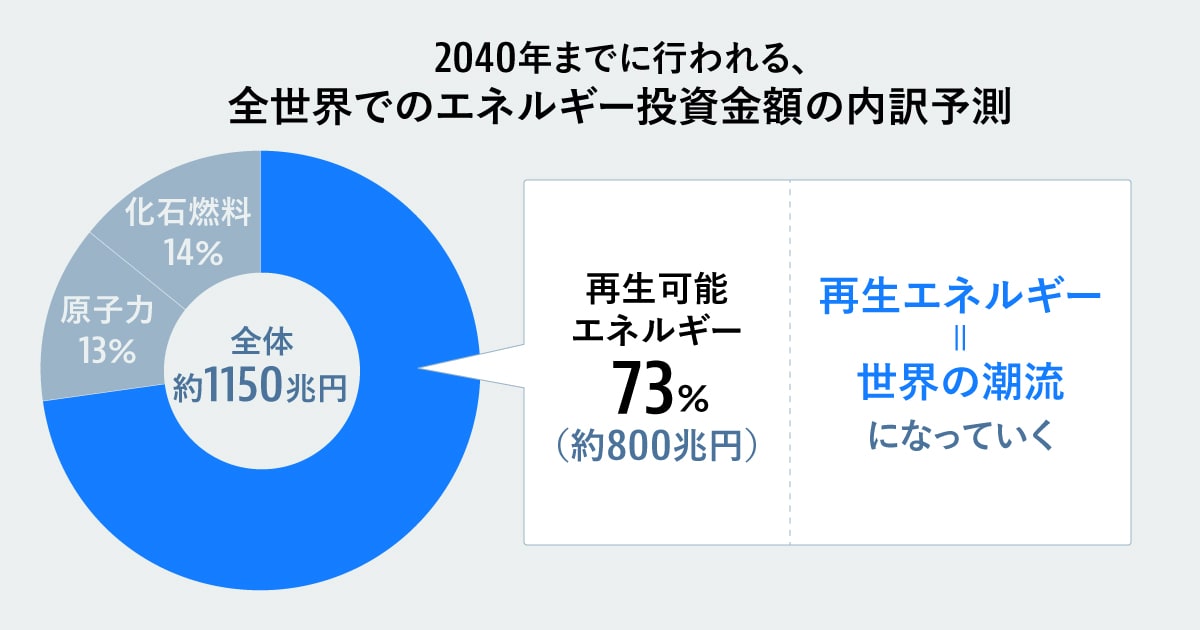 現在、世界のエネルギー関連の投資金額のうち、7割が再生可能エネルギーに関するものです。また、世界の3分の2の国における一番安い発電方法は、再生可能エネルギーによるものです。日本の再エネによる発電量の割合はまだ全体の2割程度ですが、そう遠くない未来、全発電を再エネで賄う国が出てくるかもしれません。