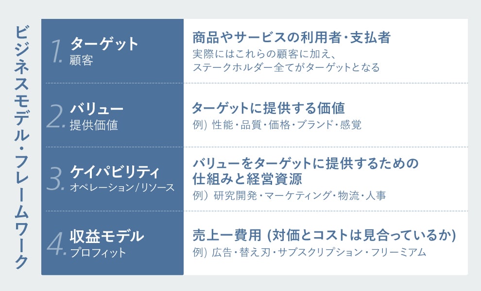 そしてこの「経営学」——「ひとつ上の視点(経営視点)」からビジネスを「統合的に」理解する際に用いるフレームワークが、「ビジネスモデル」です。今回紹介するビジネスモデル・フレームワークは、「ターゲット」「バリュー」「ケイパビリティ」「収益モデル」という4つの要素でできています。