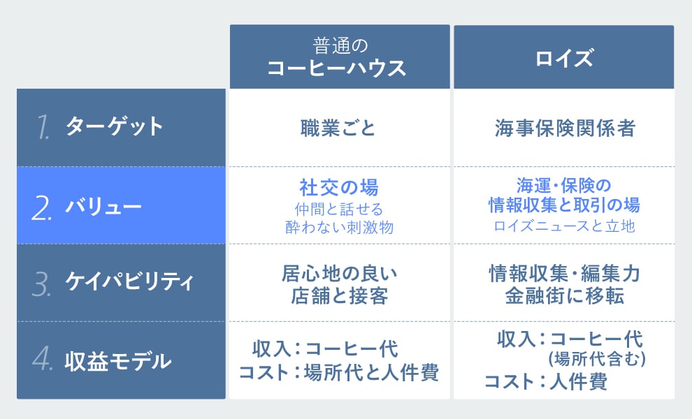 さてこの話をビジネスモデルの視点から、整理してみましょう。世界最強の保険会社へと発展していったロイズ・コーヒー・ハウスは、ターゲットを海事関係者に絞り、従来のカフェの価値そのものを変えました。「社交の場」から「取引の場」へ、そして最新情報の提供(ロイズニュース)、立地(金融街のど真ん中)というバリューと、それを支えたこまめな情報収集・編集力というケイパビリティが、ロイズの新たなビジネスモデルとなったのです。
