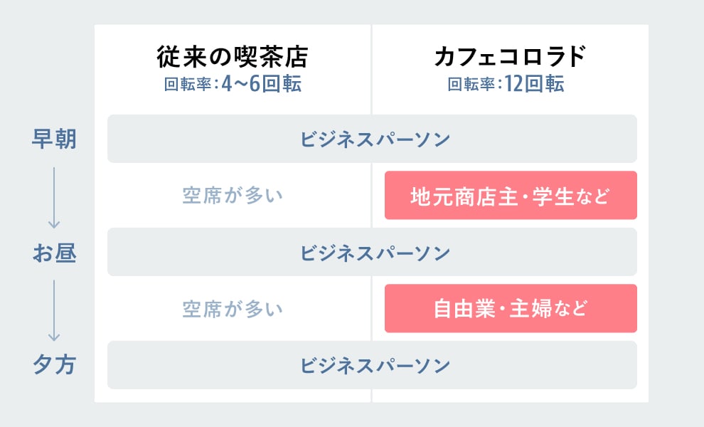 ある年、業界団体でヨーロッパ視察をし、朝のパリのカフェで刮目します。カフェで立ち飲み! 手軽でおしゃれな朝食! 帰国後彼はまず、健康的で明るい雰囲気の「カフェコロラド」をつくりました。おかげで客層は拡がり、午前や午後のヒマな時間帯の席を埋めることに成功。席の回転率がアップしたことで収益性が上がりました。