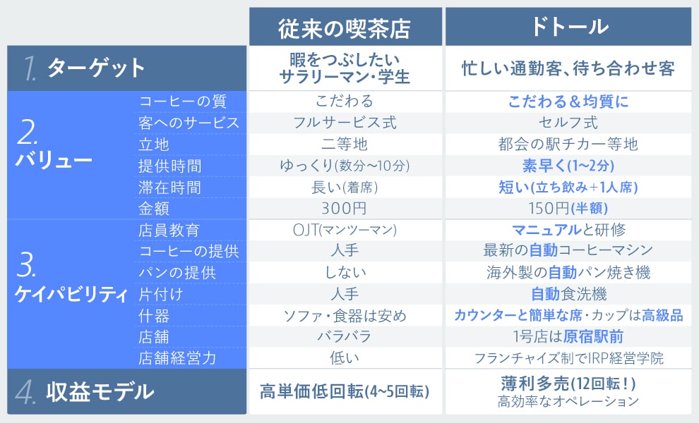 そして1980年、鳥羽博道はドトールを開業します。パリの朝カフェに着想を得た新業態です。ドトールのバリュー(提供価値)は、「美味しいコーヒーを安く半額で!」でした。ターゲットは「忙しい人たち」。なので立地は都会の駅近一等地で、テイクアウトや立ち飲み、もしくは1人席での短い滞在時間を想定しています。当然セルフサービスで、商品の提供は1~2分で素早く。