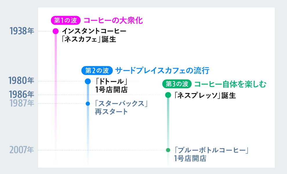 まずは世界のコーヒービジネスの歴史を紐解いてみましょう。最初にコーヒー業界に訪れた変化は、ネスレが1938年においしいインスタントコーヒー(ネスカフェ)を開発し、拡販したことによる「コーヒーの大衆化」です。これは「第一の波」と呼ばれています。「第二の波」はスターバックスのようなサードプレイスカフェの流行。そして「第三の波」では「コーヒー自体を楽しむ」という価値観のもとで、ブルーボトルコーヒーのようなサードウェーブコーヒーや、ネスプレッソが生まれました。