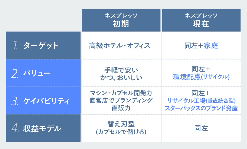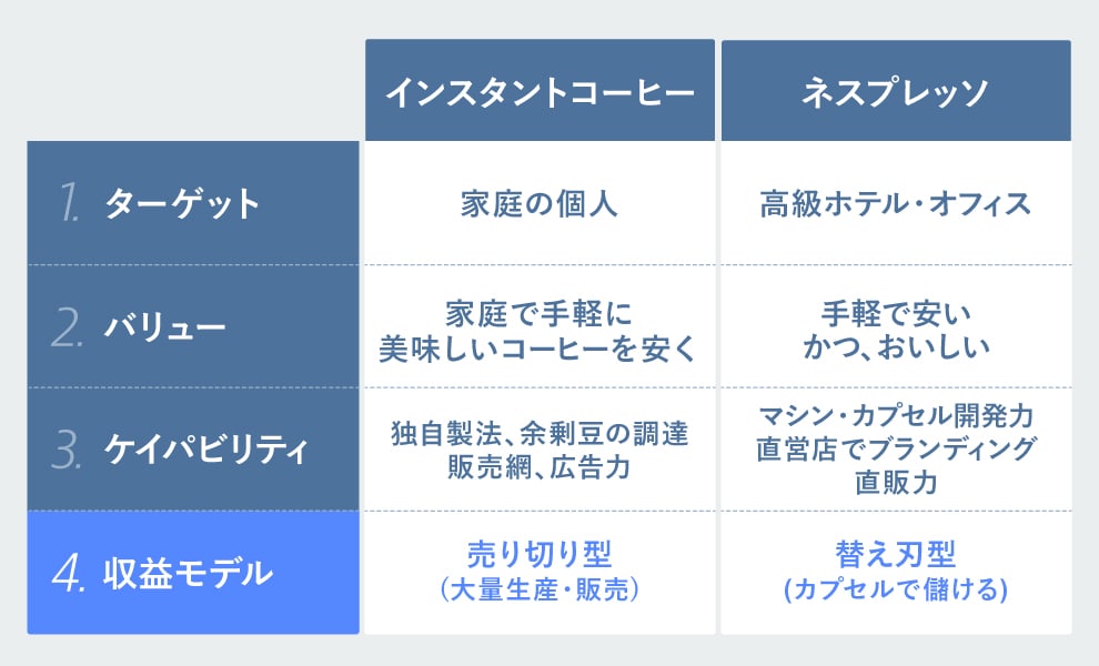 ネスプレッソが狙ったのは「手軽で安い」と「おいしい」の両立です。ネスプレッソでは、契約するとエスプレッソがつくれるコーヒーマシンが無料で貸与されます。ただし、その後は専用の純正コーヒーカプセルをひとつ50~100円でネスレから直接購入するという、いわゆる「替え刃型」収益モデルのビジネスです。ターゲットは法人(オフィス)やホテルを狙い、バリューは先述した「手軽で安く、かつおいしい」、ケイパビリティはマシンやカプセルの開発力・特許取得、直営店でのブランディング、収益モデルは純正カプセルの継続購入による「替え刃型」です。