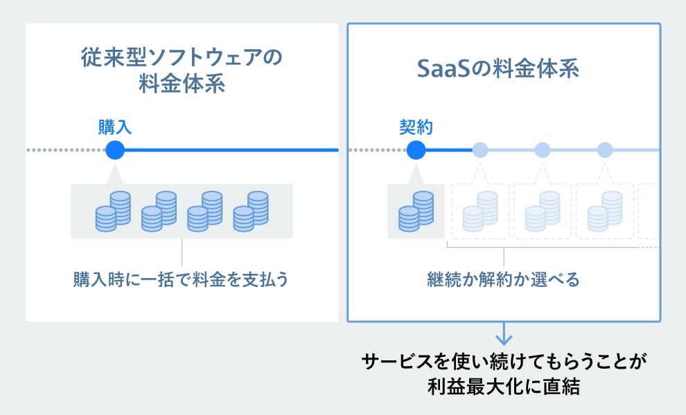 SaaSの大きな特徴は、「顧客の成功の最大化が自社の利益になる」という点にあります。なぜならSaaSは、顧客がサービスを"使い続けてくれること"で、企業が収益をあげられるビジネスモデルだからです。少しでも顧客に不利益が生じれば、解約に繋がりかねないため、顧客との信頼関係をひたむきに構築し、サービスを使い続けてもらうことが大切です。つまり、顧客の継続利用とそれによる成功こそが、売上の最大化に直結する極めて重要な指標になります。