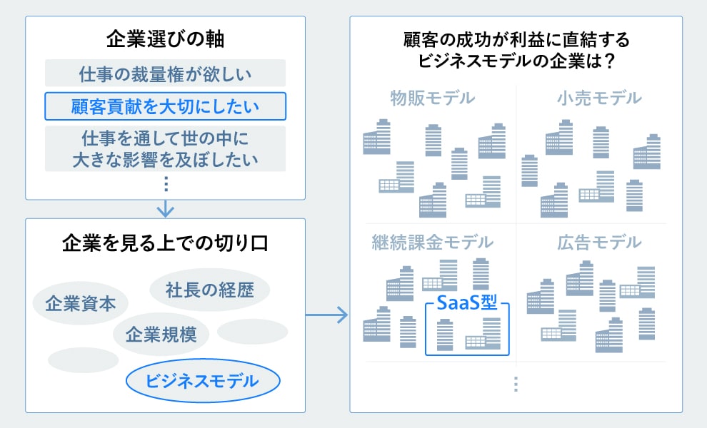 そして、企業選びで何よりも大切なのは、業界や企業の規模、企業理念といったメジャーな切り口を無思考に使用するのではなく、自分の目的に合った切り口を持つことです。「顧客貢献を大切にして働きたい」「仕事を通して世の中に大きな影響を及ぼしたい」という目的を持つ方にとっては、SaaSというビジネスモデルは企業選びの大きなヒントになるでしょう。理念に顧客貢献を掲げているか否かや、会社の規模感だけではなく、実際に顧客とwin-winの関係性を築くことのできるビジネスモデルなのか、ビジネスモデルが労働集約的でないかを確認することで、より目的に合致した会社を選ぶことができるはずです。