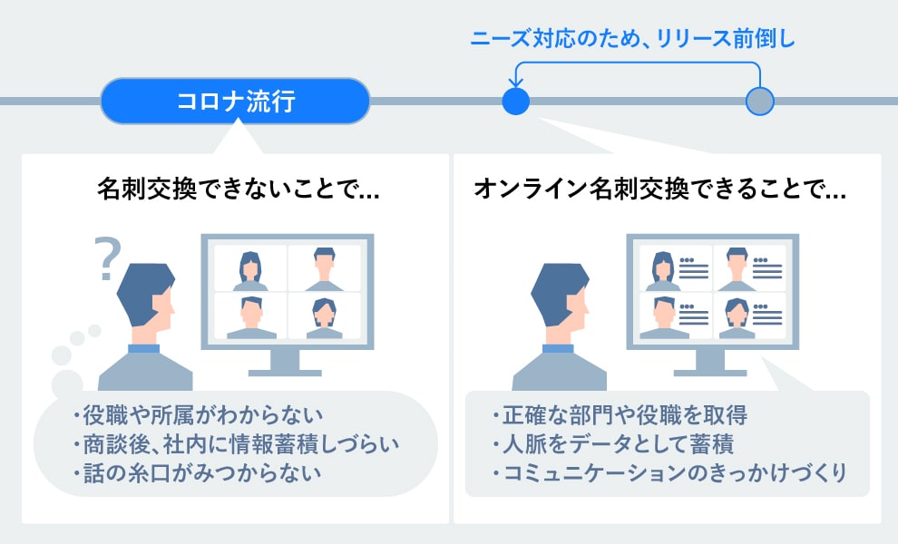 また、CSのみならず、開発・マーケティング・営業などすべての部門が顧客への価値提供を強く意識しており、一貫して顧客ニーズに真摯に寄り添う姿勢に同社が選ばれる所以があります。実際に2020年6月には、オンライン商談で名刺交換ができる「オンライン名刺交換」の機能※2をリリースし、コロナ禍における企業のリモートワークシフトにいち早く対応しました。