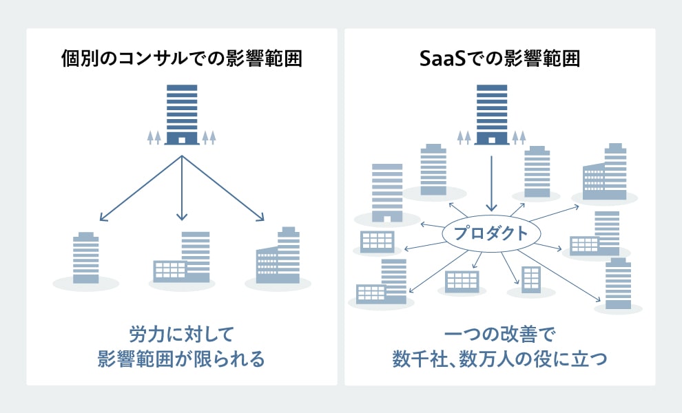 SaaSという観点だと、大きな影響力を持てることですね。一社一社へのコンサルティングでは、自分の労力に対して与えることのできる影響範囲は限られますが、SaaSは一つ改善をすればそれが数千社、数万人の役に立ちます。同じ労力と思いを込めて取り組むのであれば、個人的には後者のほうがより意義を感じられると思います。
