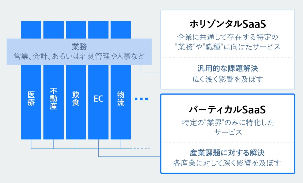 そもそもSaaSには、大きく分けて二つのタイプがあります。多くの企業に共通して存在する"業務"に着目した「ホリゾンタル(水平型)SaaS」と、ある特定の"業界"のみに特化した「バーティカル(垂直型)SaaS」です。