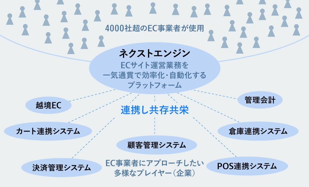業界のプラットフォーマーとして多種多様なプレイヤーと共存共栄できていることも強みの一つです。実際に約25%を占める市場シェアの高さ※5から、多くの企業とパートナーシップを組んで連携を深めています。EC市場の伸びに伴い、今後も次々に新たなプレイヤーが現れることが予測されますが、そうした企業とも競合せず、共に進化し成長していくことができるのも私たちの特徴ですね。