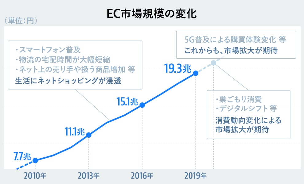 国内のEC市場はこの20年間で、20兆円規模へと成長しました。今後デジタルネイティブ世代が購買力を持ち、2025年には約28兆円規模にまで及ぶという予測※4もあるなかで、様々なEC事業者の成長を支えるプラットフォーマーとして、ネクストエンジンのさらなる成長が期待されます。