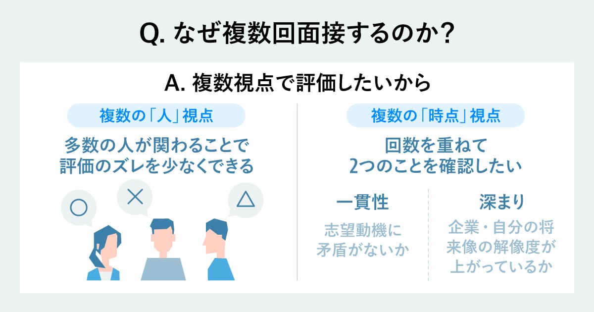 そもそもなぜ、企業は何度も選考面接をするのでしょうか。それは、回数を重ねることで複数人の視点で評価をすり合わせているからです。採用はみなさんと企業の将来を左右する大事な活動なので、評価ポイントのズレや相性といった面接官由来の要素を極力取り除いた状態で判断しようとしています。
