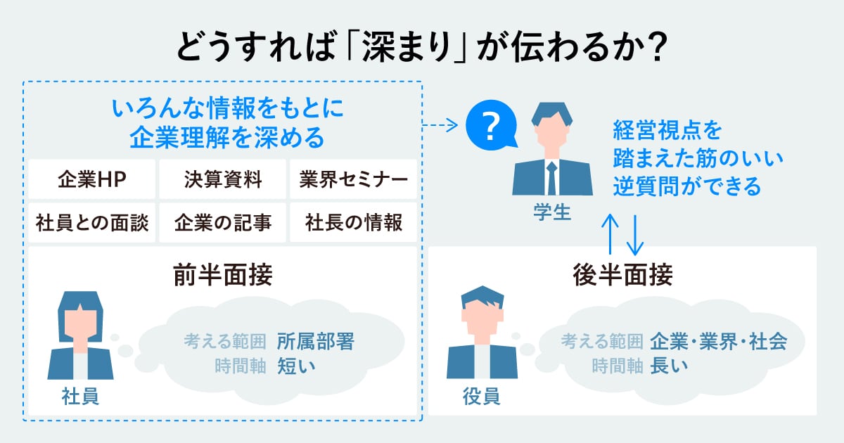 また、企業理解の深まりが自然に面接官に伝わるのが逆質問です。後半の面接になるにつれて、部長や経営者が対応することが増えます。上位役職者や経営者は、一つの部署ではなく企業、業界、社会全体と10年後、20年後の時間軸を見ていて、今だけに視点を留めていません。面接を重ねるごとに企業理解が進んでいれば、経営やビジネスに対する理解も増して、今後のビジョンや取り組み、若手に期待することなど、経営側の視点を踏まえた筋の良い質問をすることができます。