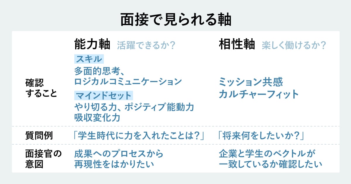 それでは面接官の意図を探るための2つの軸とは何かを見ていきましょう。「能力軸」は、その人が企業でどのような活躍ができるか、「相性軸」はその人が企業に合っているのかを確かめるものです。2軸に基づき面接官が具体的に確認していることの一例を紹介します。