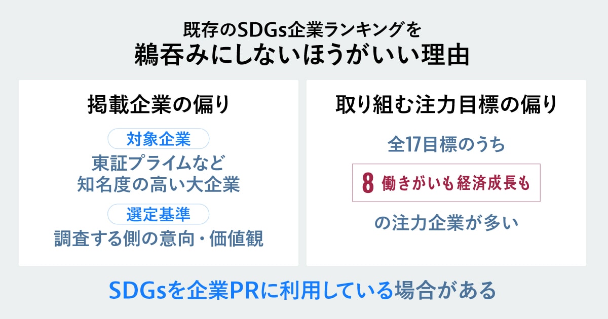 日本企業の約半数がSDGsに積極的となると、そこからどうやって絞ればいいのでしょうか? 「SDGs 企業」で検索すると、有名な経済メディアによるSDGs企業ランキングがいくつか出てきますが、それらを鵜呑みにするのではなく、あなたの視点や価値観に沿って選ぶ必要があるでしょう。