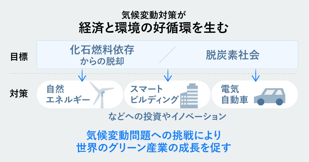 気候変動ソリューション成長の背景には、温室効果ガスの主要排出国が掲げる2050年カーボンニュートラル(脱炭素社会)を目指す取り組みや原油価格の上昇もあります。そして脱炭素や脱原油依存の手段として、自然エネルギー、電気自動車、スマートビルディング(建物IoT化)などへの投資やイノベーションが促されています。このように、気候変動問題への挑戦が世界のグリーン産業成長を牽引し、経済と環境の好循環を生み出すカギとなっているのです。