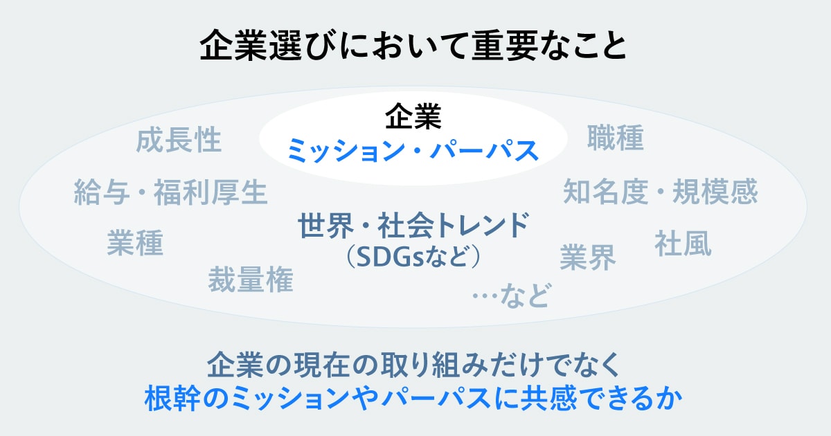 SDGsの達成期限は2030年ですが、皆さんのキャリアはその後何十年も続きます。 SDGsの取り組みだけではなく、「より長期的な企業の存在意義であるミッションやパーパスに共感できるか」もお忘れなく。