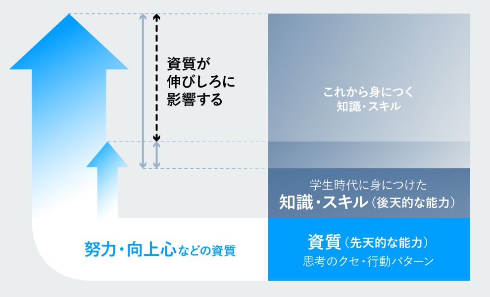 さらに、知識やスキルをどれだけ獲得できるかには、「良い機会があるか」という環境要因に加えて「努力」や「向上心」といった資質も大きく影響します。エンジニア職など専門性が求められる一部の職種は例外ですが、ポテンシャル採用の傾向が強い日本では、学生時代に身につけた知識やスキル以上に「どれだけ伸びしろがあるか」という資質の有無を重要視しているのです。