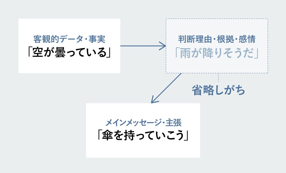 多くの学生の自己PRは、「空が曇ってるから傘を持っていこう」と「判断理由、根拠・感情」が省略されている場合が多いです。日本は世界の中でも非常にハイコンテクストな国と言われており、普段の会話でも「空が曇っていて雨が降りそうだから傘を持っていこう」のように判断理由まで含めて話す人は少ないですよね。しかし面接においては、面接官が一番知りたい「判断理由」を省略してしまうと、適切な判断ができなくなります。