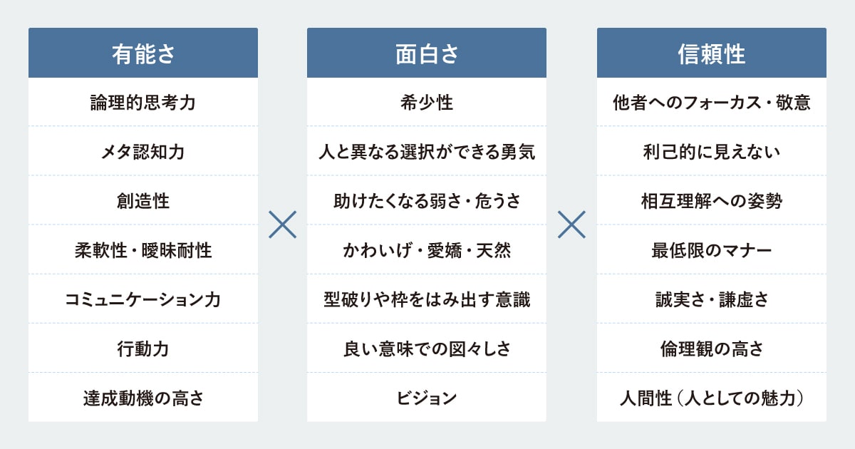 「有能さ」は今言っていたような論理的思考力・メタ認知力・コミュニケーション能力、「信頼性」は自己中心的でない姿勢・相手への敬意・誠実さ、「面白さ」は希少性・他人と違う選択をする勇気・人に手を差し伸べてもらえる可愛げといったものですね。