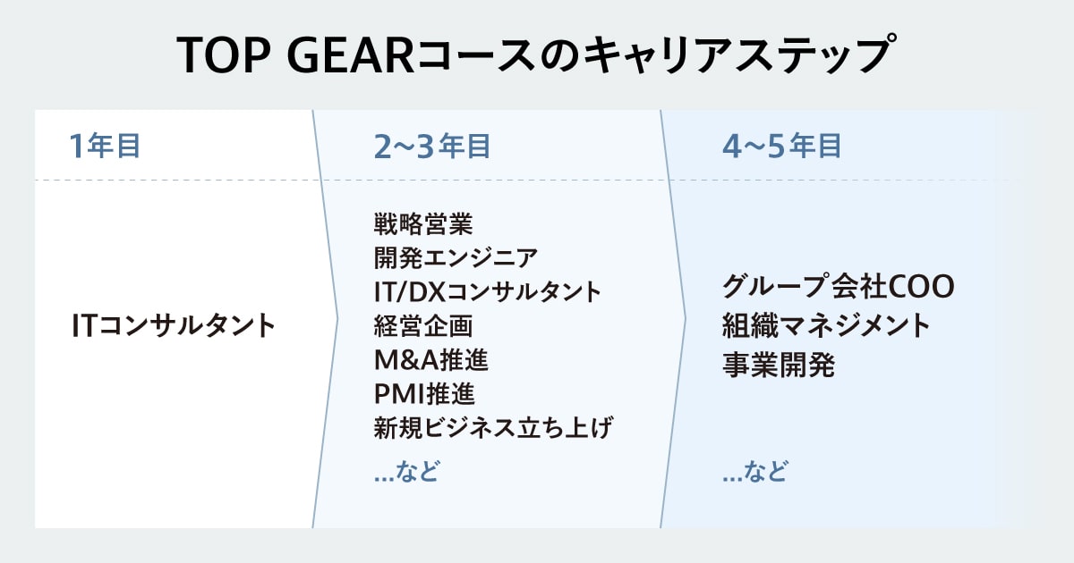 菅原:当社の新卒採用では学生の特性や成長意欲に合わせて4つの採用枠を設けています。なかでも圧倒的なスピードで成長したいという志を持つ方を対象としたTOP GEARコースのキャリアステップを紹介しましょう。まず、入社後の1〜2年間はITコンサルタントを担ってもらいます。お客様の企業のプロジェクトに入り込み、課題を解決したり、DXを推進したりする仕事です。
