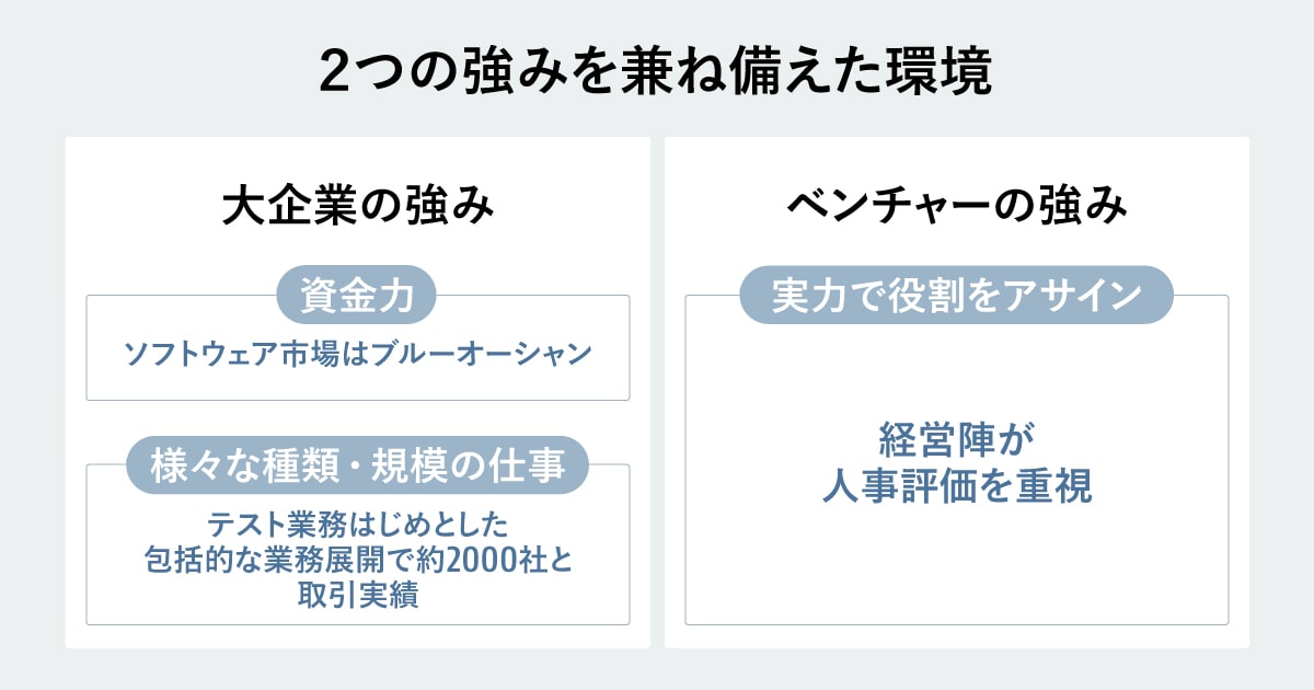 まず資金力について、当社は11期連続で売上高成長率150%を達成しています。これほど業績が成長しているのは、私たちが事業の軸足を置くソフトウェアテスト市場が、広大なブルー・オーシャンだからです。