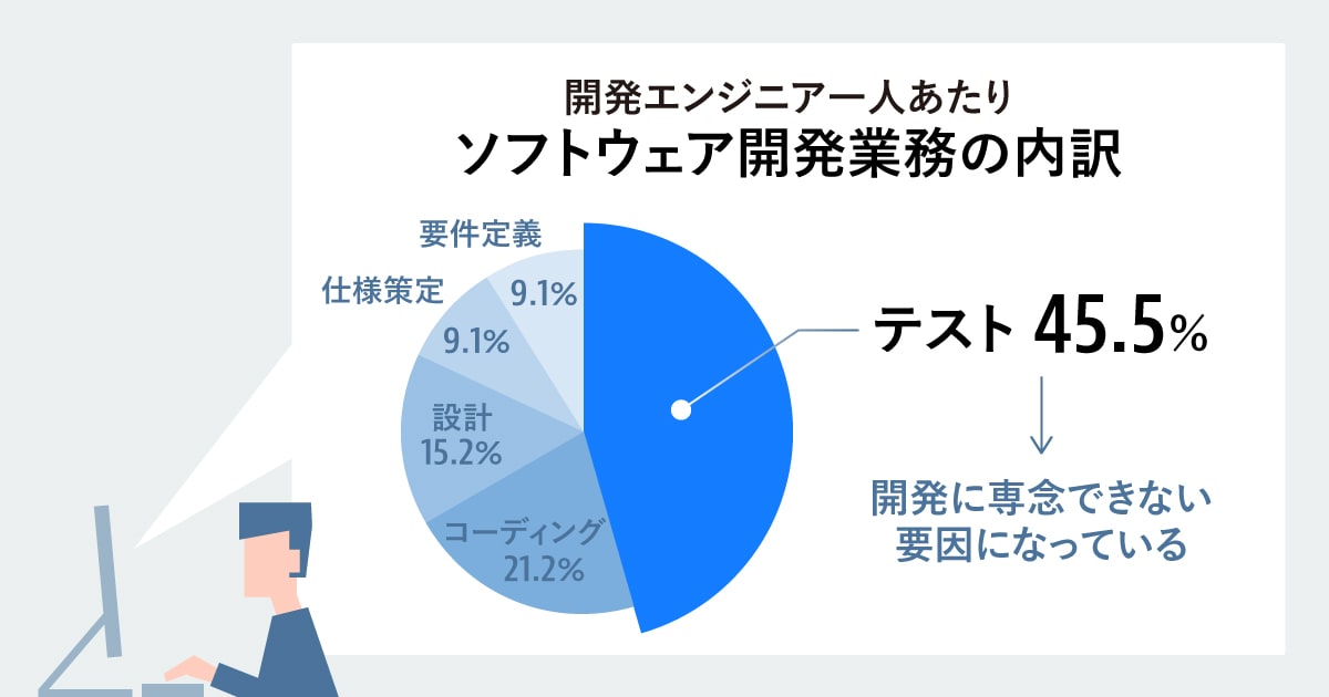 ソフトウェアテストとは、開発したソフトウェアが仕様書通りに正しく動作するか、欠陥がないかなどを確認する仕事です。テスト業務には地味なイメージを持つ方も多いかもしれませんが、実は開発エンジニア一人あたりの工数の約45%も占めています。開発エンジニアにとっては負担が大きく、開発に専念できない要因ともなっている業務なのです。