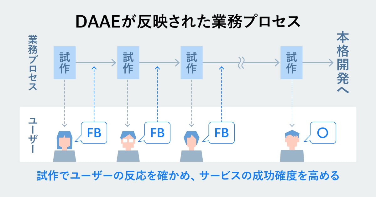 具体的な業務には、数多くの試作モデルを素早くリリースし、ユーザーの反応を確かめながら改良や方向転換を繰り返すことで、サービスの成功確度を高めるという形で落とし込んでいます。このDAAEのコンセプトを反映したDAAE部門もスタートしており、様々な分野で専門性を持つ優秀なメンバーがチームを組んで企画フェーズからお客様のプロジェクトに参画し、お客様のサービスを成功に導いています。