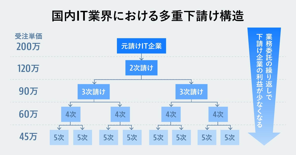 もう一つの課題が、多重下請け構造です。これは、ITシステム開発などを一括受注した企業が、その一部の業務を2次請けの企業に発注し、2次請けの企業がまた一部の業務を3次請けの企業に発注する……といった業務委託を繰り返す、SIer企業によくある構造のことです。下請け企業は実労働に比べて得られる利益が少なくなり、それに伴ってエンジニアも低賃金になるといった問題点を抱えています。