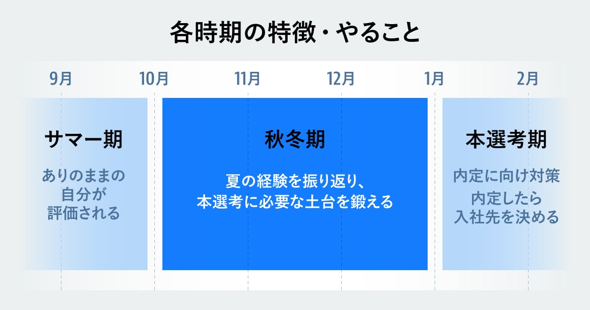 - 秋冬(10月~年末まで):夏の経験を振り返り、本選考に必要な土台を鍛える。