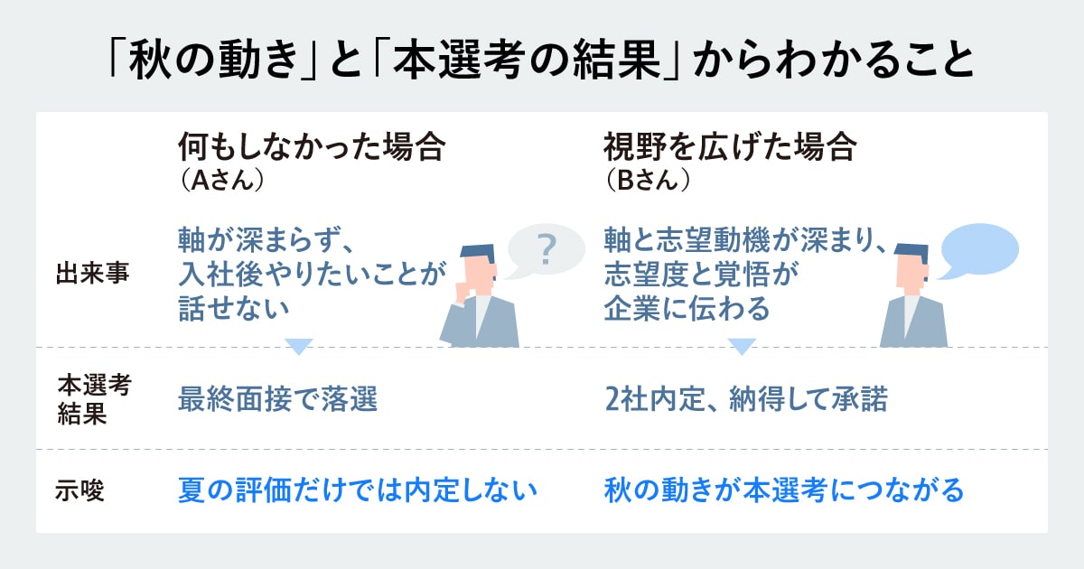このように、秋に動くかどうかで、意思決定軸と志望動機の深み、意思決定における納得度が大きく異なってくるのです。もしサマーで手応えがなかったとしても、秋にやるべきことを実践すれば本選考で挽回できます。