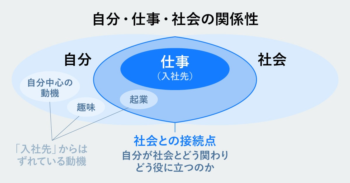 就活を経て社会に出るというのは、「仕事や入社先」を通じて社会とつながることですが、接続点を自分の言葉で伝えられないと、面接官からは「うちに入社しなくても趣味としてやるか、自分で起業したらいいんじゃない?」と言われてしまいます。