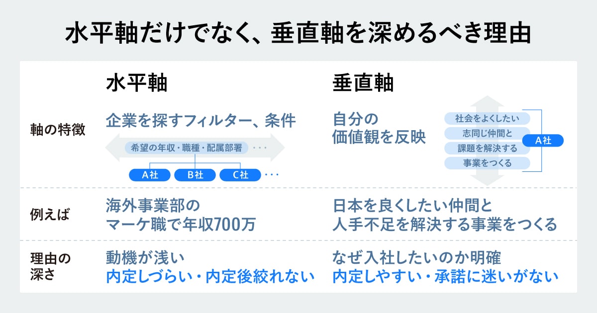 よく軸として「年収、裁量権、職種、配属ポジション」などを挙げる人がいますが、それは企業を探す際の条件面であり、ここでは「水平軸」と呼んで区別していきます。水平軸しかないと自分の言葉で軸を語れず、動機が浅いままで内定獲得しづらい上に、水平軸が同じような企業に数社内定した場合、決め手がなく意思決定ができません。