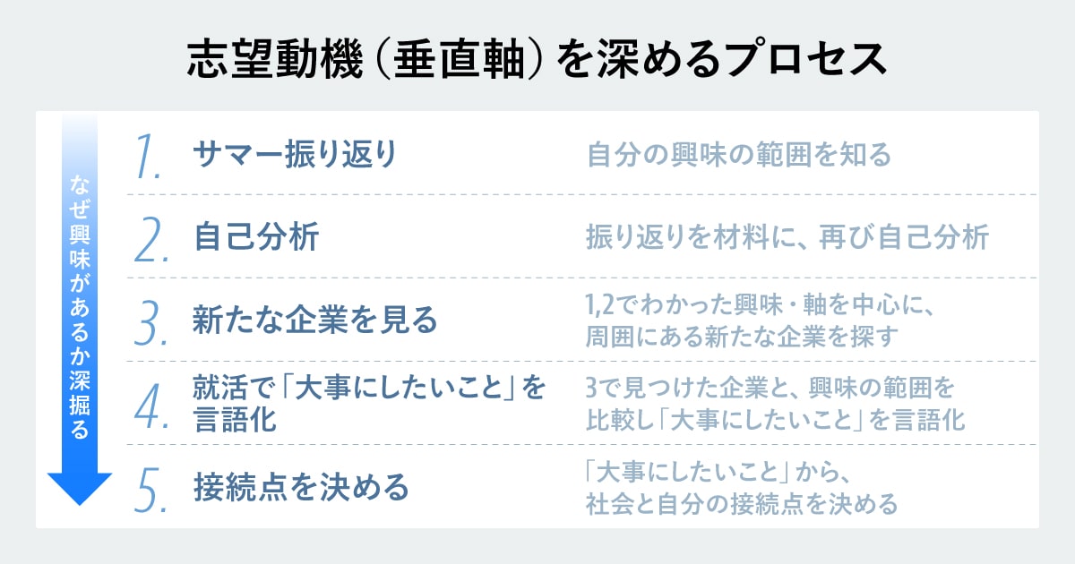 堀本:サマーでは狭い視野で興味の範囲内しか見ていないことが多く、社会とのつながりの観点が弱いからです。そのため、サマーで決めた軸や動機は自分中心で、企業から見ると浅いものになりがちです。