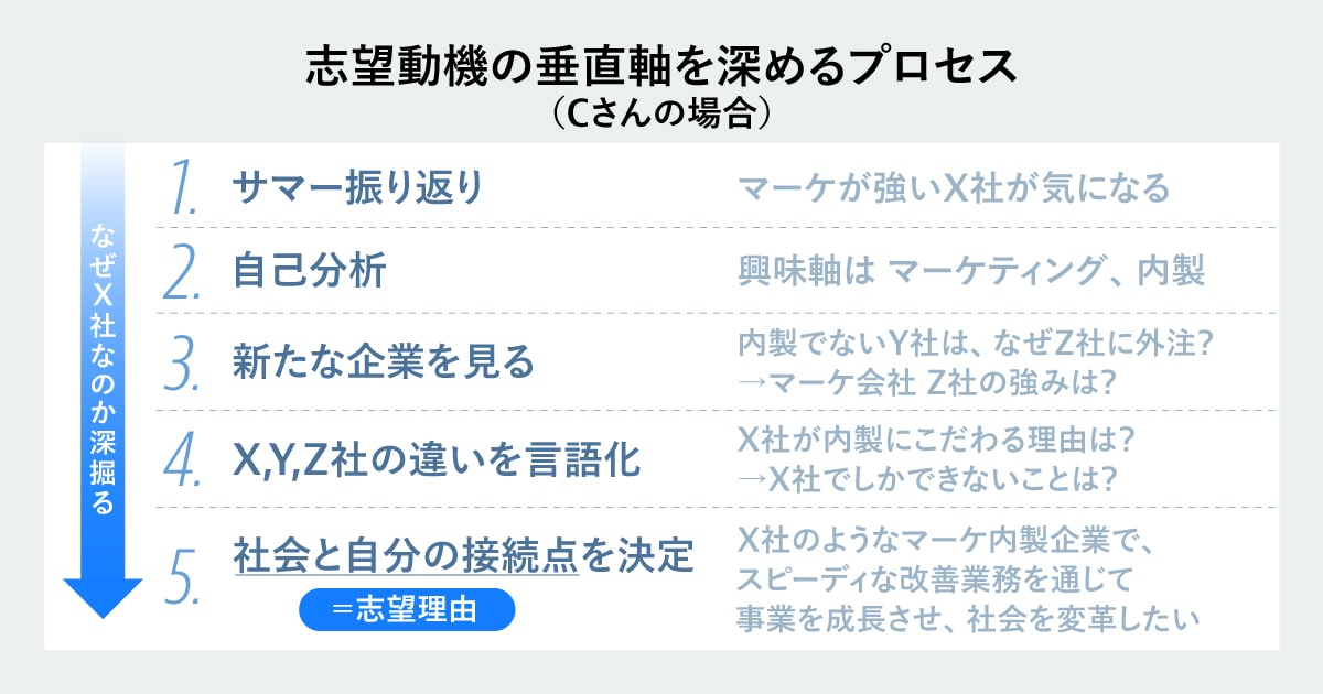 すると、内製のメリットデメリットはもちろん、X社が内製にこだわる理由や強み、X社に入社しないとできないであろうことが、1周まわってより具体的に見えてきました。こうして、Cさんは「マーケティングを自社で内製している企業でスピーディな改善業務を経験して事業を成長させる」という垂直軸ができました(④就活で「大事にしたいこと」を言語化)。