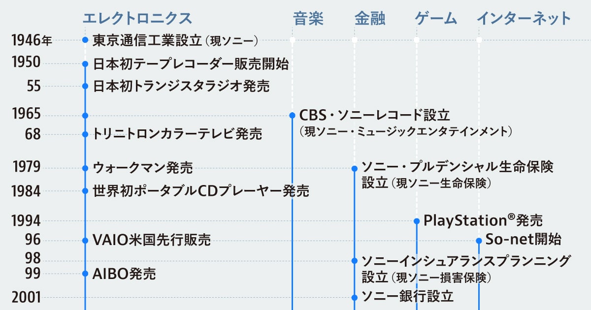 異業種にも参入を続けています。金融分野では1979年にソニー生命の前身であるソニー・プルデンシャル生命保険を設立し、1998年には現在のソニー損害保険となるソニーインシュアランスプランニング、そして2001年にソニー銀行を設立しています。