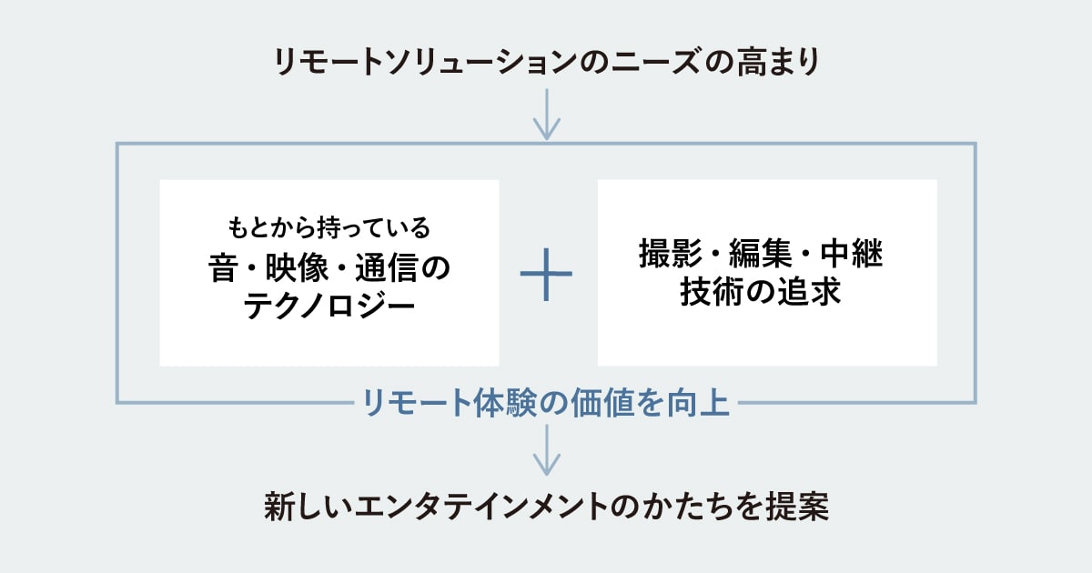人と人、人とモノを遠隔でつなぐリモートソリューションのニーズの高まりも、ソニー にとっては追い風となっています。もともと音・映像・通信のテクノロジーに強いため、撮影・編集・中継の技術を追求して、リモート体験の価値をさらに高めることができるからです。遠隔での音楽ライブなど、新しいエンタテインメントのかたちも提案できます。