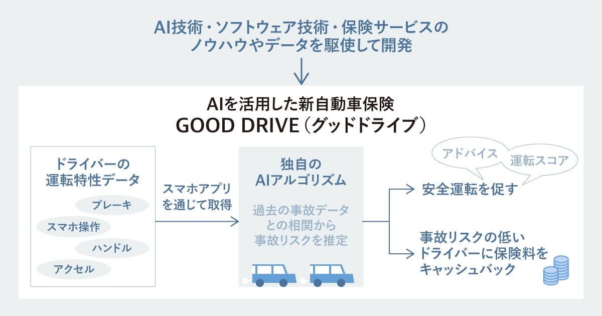 例を挙げましよう。金融分野でいうと、AIを活用した新自動車保険商品の発売などが、それにあたります。運転特性連動型自動車保険「GOOD DRIVE(グッドドライブ)」です。