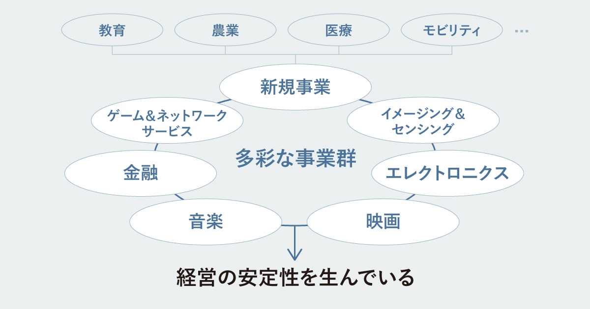 この他にも農業や医療、教育といった、ソニーにとって新しい事業領域での取り組みも始まっています。この多彩な事業群が、経営の安定性を生んでいるのです。