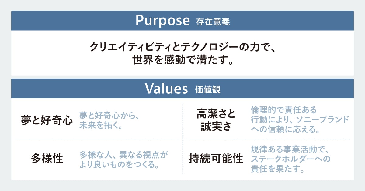 ソニーは、創業時から脈々と受け継がれている「技術の力を用いて、人々の生活を豊かにしたい」という想いをもとに、2019年に企業としての存在意義を「Sony's Purpose & Values」として刷新しました。その内容は、「クリエイティビティとテクノロジーのカで、世界を感動で満たす」というものです。