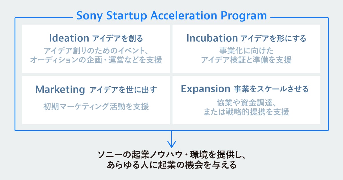 2014年に始まった「Sony Startup Acceleration Program(旧・Seed Acceleration Program)」は、事業アイデアを持つ社内外の人に、ソニーが持っている起業のノウハウや環境を提供するプログラムです。このプログラムでは、あらゆる人に起業の機会を与えることを謳っています。
