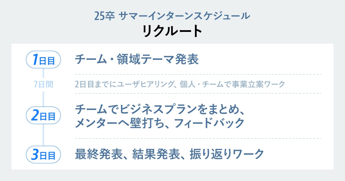 26卒向けサマーインターンは、25卒と同様、大まかな形式を変えず7/12(金)からと、7/26(金)からの計2タームを開催(現在エントリー募集中:4/3(水)13:00〆切)。例年以上に、リクルートのビジネスのリアルを体感していただきつつ、将来どのようなキャリアを選択するとしても役立つ、成長につながる内容・仕立てになっておりますので、「事業会社に興味がある」「就職活動という枠を超えて成長したい」という方のご応募をお待ちしております。