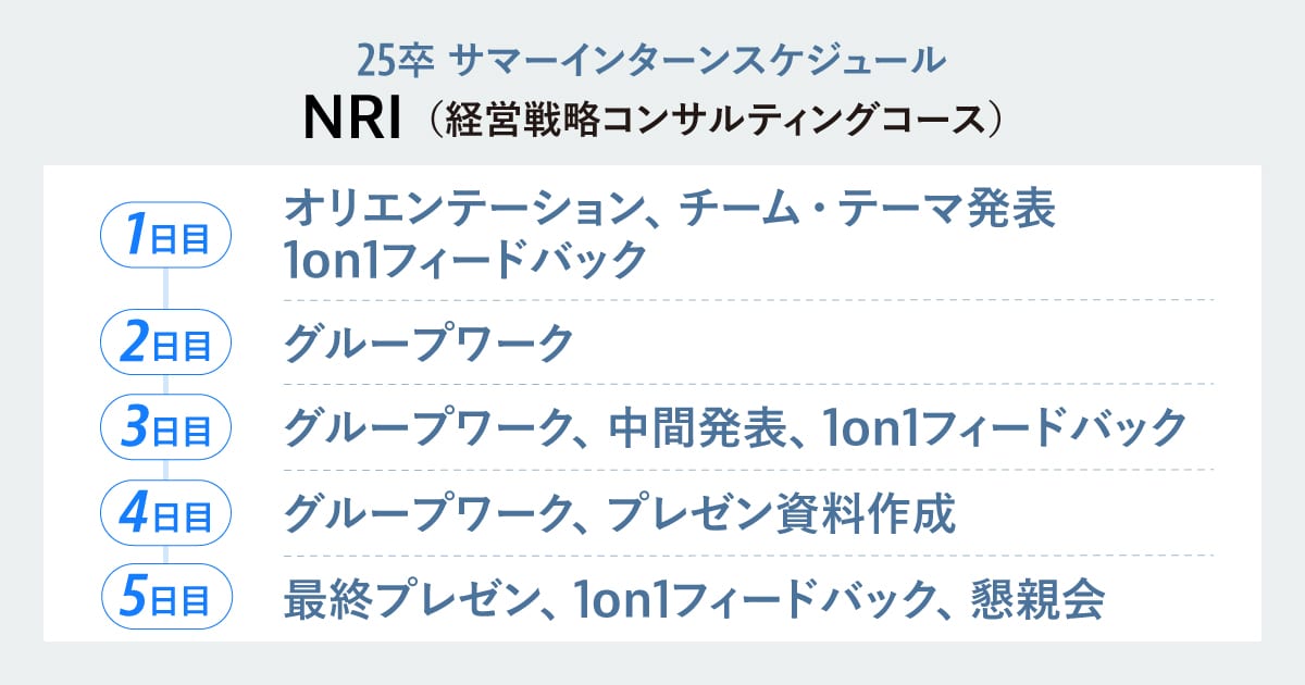 野村総合研究所(NRI)では、経営戦略コンサルティングとITソリューションそれぞれでコースを選べるインターンシップを設けました。経営戦略コンサルティングコースでは、チームに分かれて実際のクライアントの事業分析や戦略立案など、限りなくリアルなコンサルティング業務に取り組み、第一線で活躍するコンサルタントが個別にフィードバックを行いました。自らのキャリアや適性を考えていく上でも役立つ、充実した5日間のプログラムになっています。