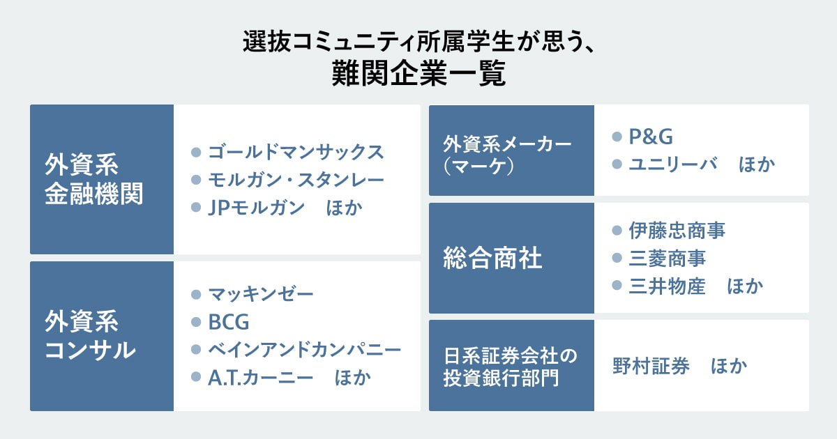 就活をしていると「難関企業」という言葉をしばしば耳にするでしょう。言うまでもなく内定を獲得するのが難しい企業という意味ですが、その定義はさまざまです。ここでは、選抜コミュニティに所属していた学生が思う「難関企業」をリストアップしてみました。