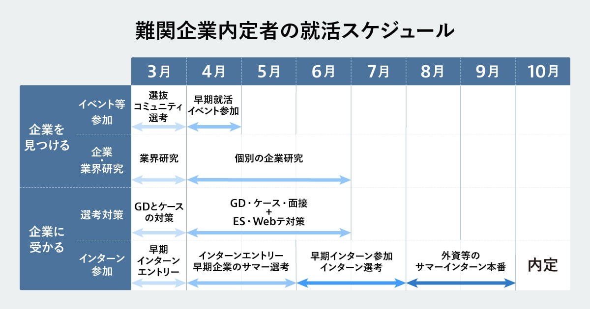 就活では「自分に合った企業を見つけること」と「その企業に受かること」という2つを進めていかなければなりません。外資系企業や難関ベンチャーは選考時期が早いため、他の学生が次年の頭までに進めるこの2つを、夏までにまんべんなく進める必要があります。あまり焦っても仕方がありませんし、サマーインターンでの学びを元に自己分析や企業研究の仕切り直しをする人も多くいますが、早期内定を獲得した先輩が集中的に時間をかけて就活対策をしていたことは、認識しておくべきでしょう。