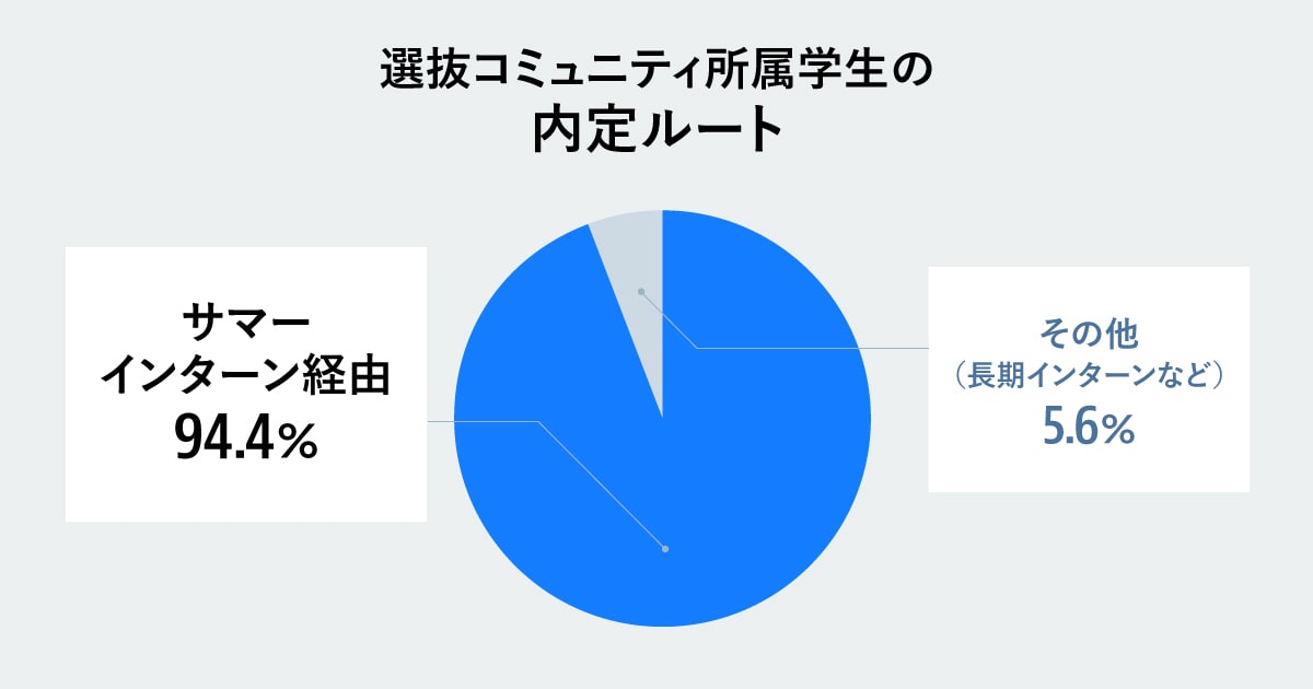 まず知っておくべきなのは、難関企業から内定を獲得するためには、サマーインターンでバリューを残すことが何よりも重要だということです。GoodfindとFactlogicが運営する選抜コミュニティ(FactLogic Executive, J-CAD)に所属していた学生が獲得した難関企業の内定のうち、実に94%がサマーインターンシップ参加者の優遇ルート経由のものでした。残りの6%も長期インターンシップでの実績を認められて内定を獲得したものです。