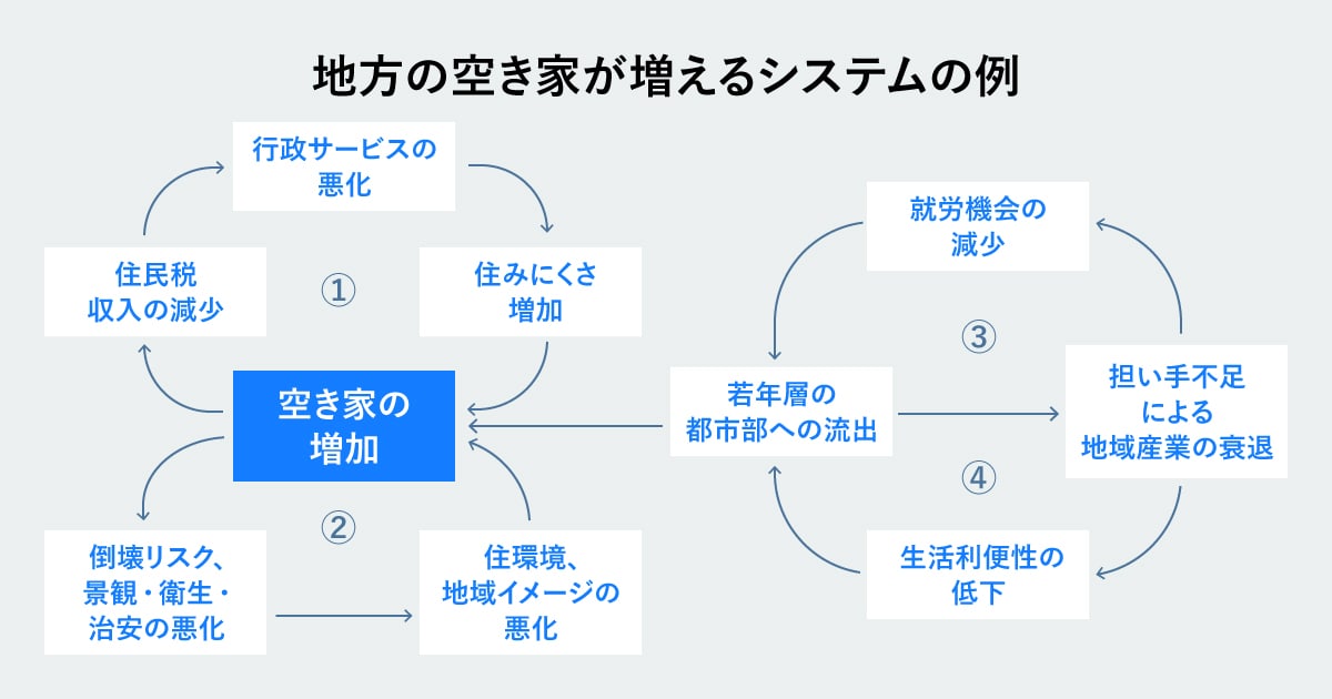 ①空き家の増加→地方の住民税収入の減少→行政サービスの悪化→住みにくさの増加→空き家の増加→…
