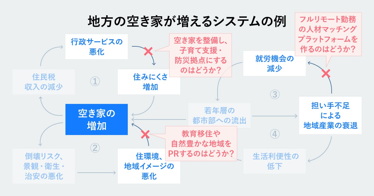 システム思考では、このシステム全体を捉えた上で「どの負のループを、どこから、どう断ち切ることで空き家を減少させられるだろうか?」と考えます。
