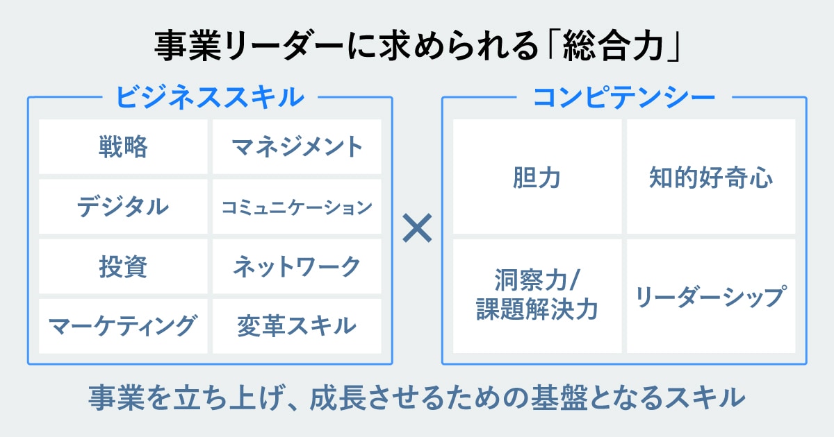 山下:それは「総合力」を持った事業リーダーだと考えています。総合力とは、事業を立ち上げ、成長させるための基盤となるスキル。これを構成するのは、戦略策定やマネジメントなどのビジネススキルと、リーダーシップや胆力など優れた事業リーダーが持つ考え方や能力であるコンピテンシーです。事業リーダーを志すZ世代の皆さんには、この総合力を身に着けることをお勧めしたいです。