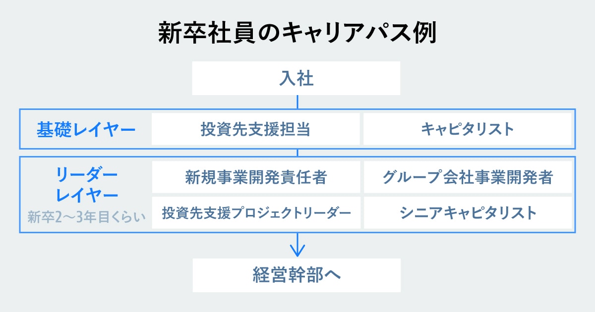 初期配属先では、事業リーダーに不可欠な総合力を、スピード感をもって身に着けられます。中でも投資先支援においては、投資先スタートアップの経営陣の立場に立って考え、ソリューションを提案する機会が毎週のように訪れる仕事なので、求められるレベルはとても高いですが、視野を格段に広げられるのではないでしょうか。何より経営全体について自分で考えて、決断し、提案した経験は、実際に事業リーダーになったときにも直接活きるものになると思います。